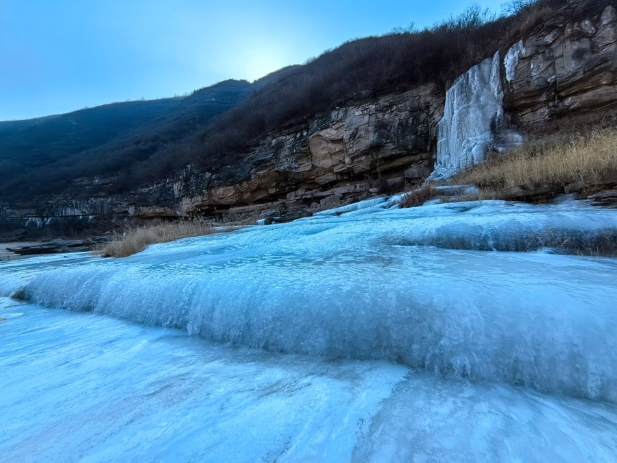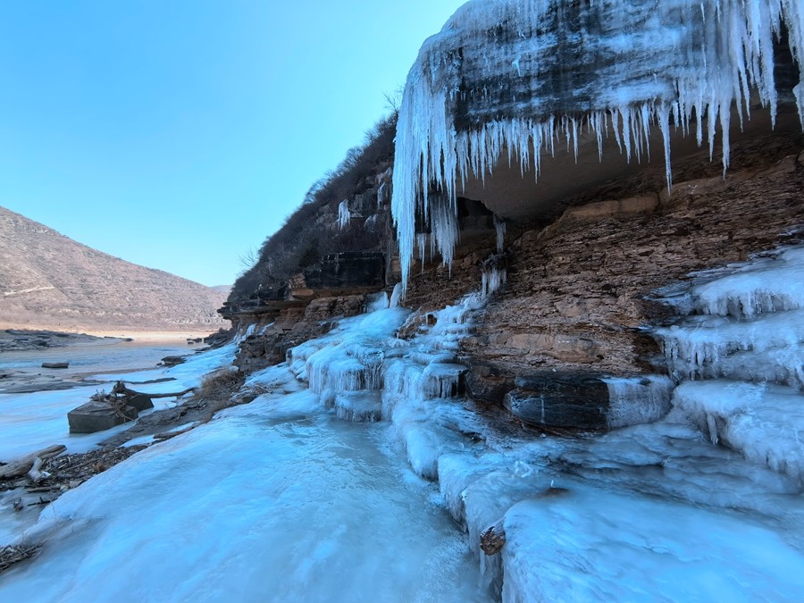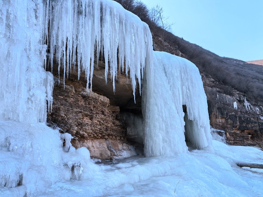 冰瀑是因天氣寒冷,水流到低于零攝氏度的地表后與巖石凍結(jié)而形成的一種自然現(xiàn)象。氣溫驟降時(shí),夏日里泉水叮咚的山谷中,卻點(diǎn)綴著一條條銀裝素裹的冰柱,往日流水潺潺的河溪凝結(jié)成潔白的“玉帶”在山間舞動,更有寬闊的巨型冰瀑高懸在崖壁之上,讓人感嘆大自然的鬼斧神工。(大佛寺礦 張洋)