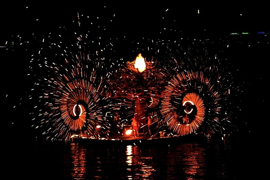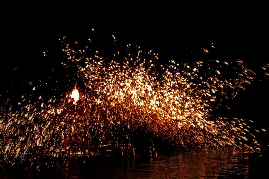 打鐵花始于北宋,距今已有千年歷史,是流傳于豫晉地區(qū)的民間傳統(tǒng)煙火,也是國家非物質(zhì)文化遺產(chǎn)之一。這一技藝需將生鐵燒至1600℃以上化成鐵水,由一人舀起鐵水拋向空中,另一人用力擊打空中的鐵水,鐵水騰空形成十幾米高的鐵花,故有“鐵樹銀花落,萬點(diǎn)星辰開”的美譽(yù)。(孟村礦 王鴿)
