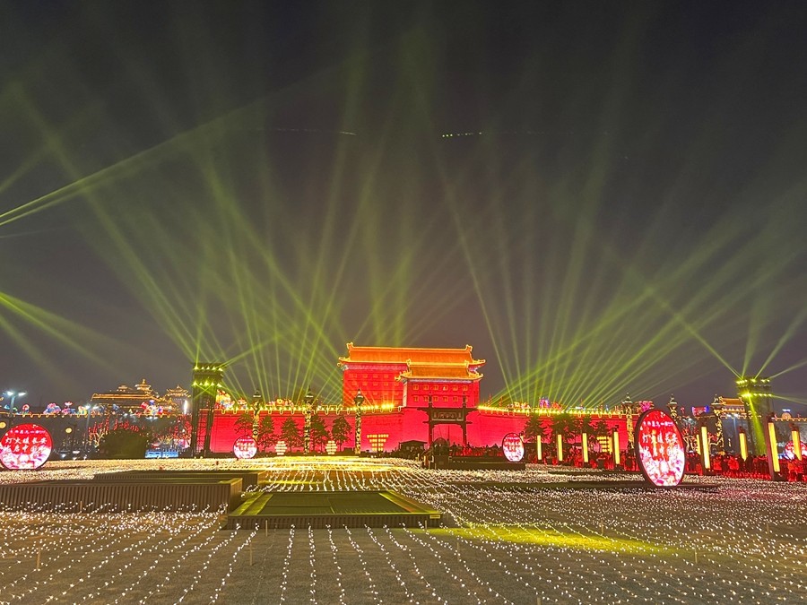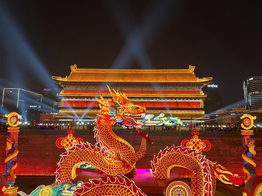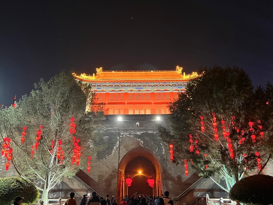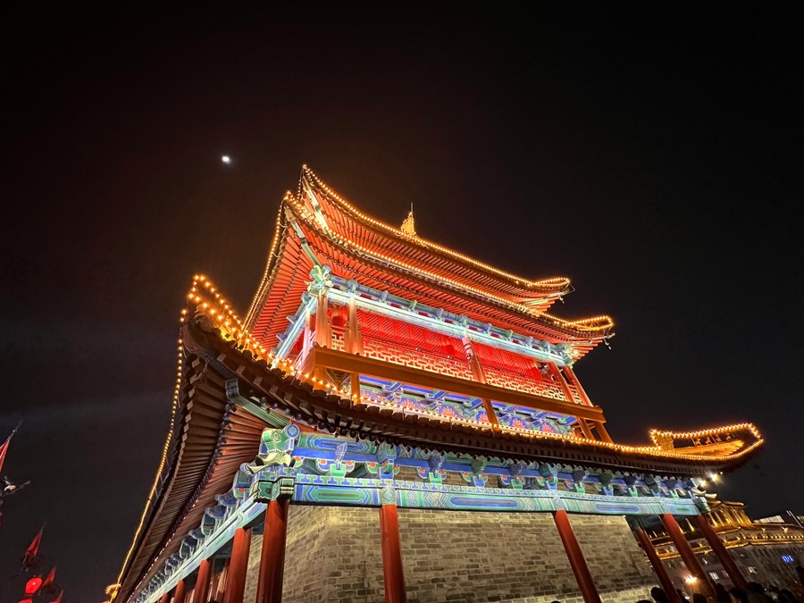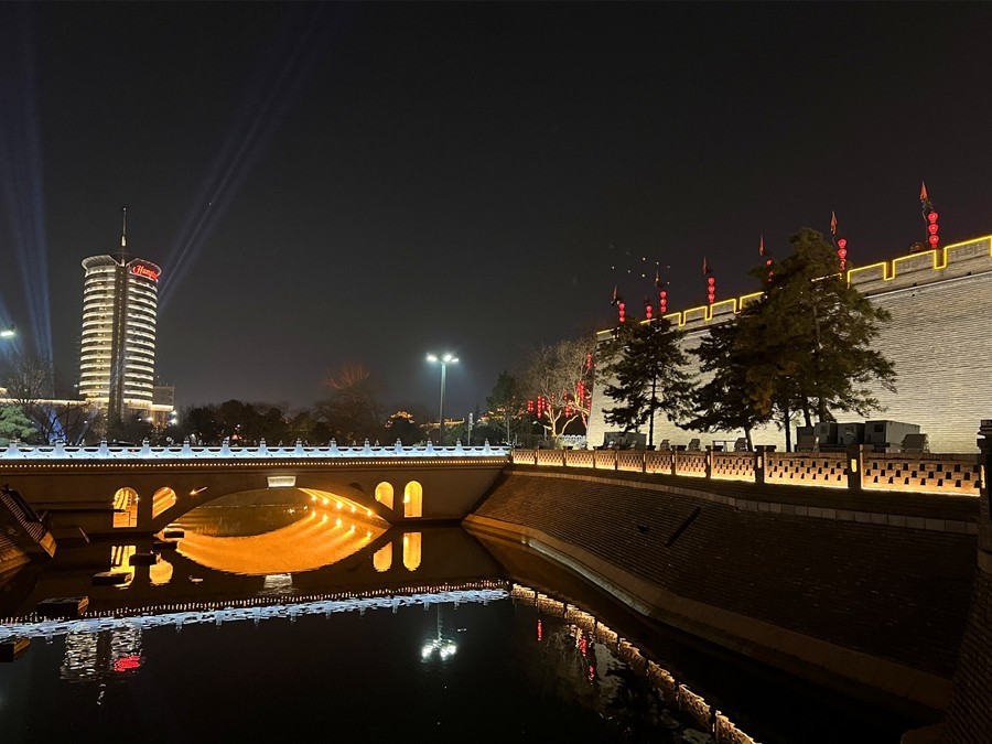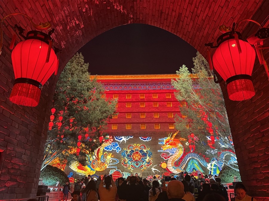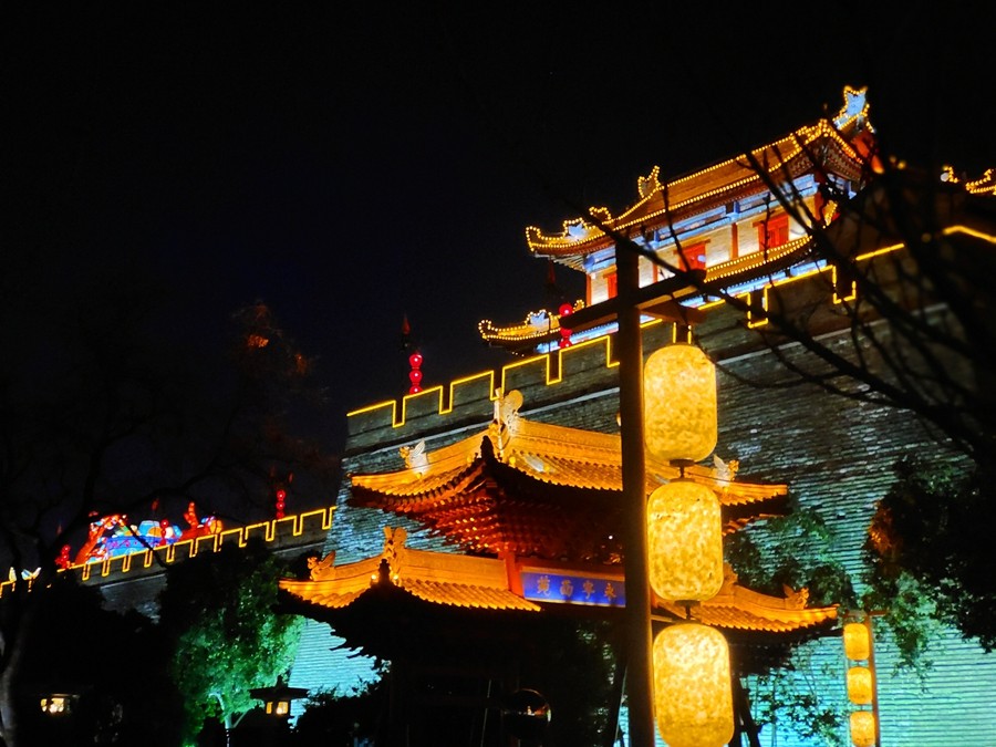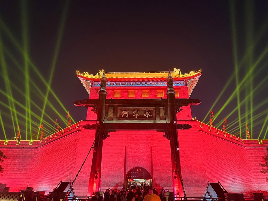 春節(jié)期間,西安城墻燈火輝煌,城上城下華燈齊亮、城墻內(nèi)外流光溢彩。身臨其中,一步一景、美不勝收,恍若再回長(zhǎng)安。(大佛寺礦 駱丹)