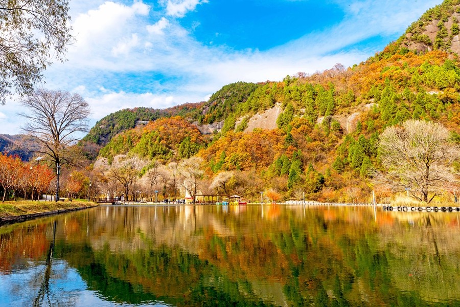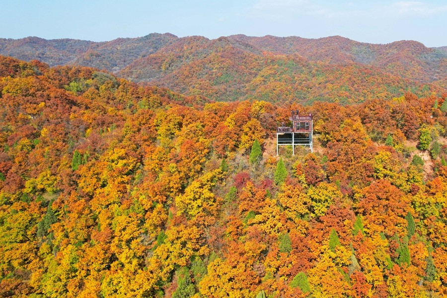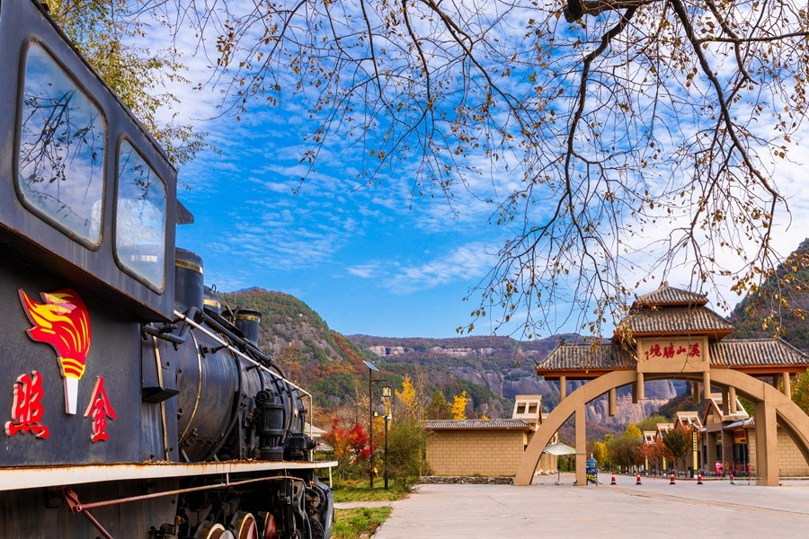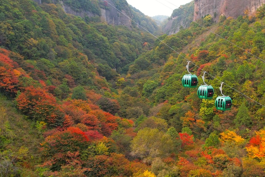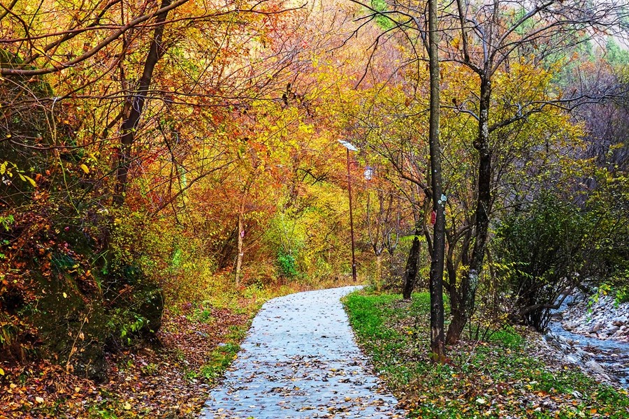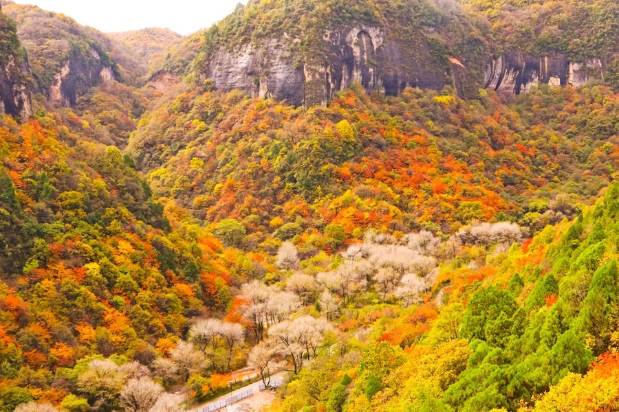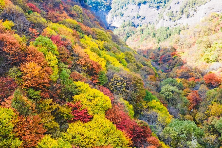 溪山勝境,位于銅川市照金鎮(zhèn),是照金丹霞地貌的核心區(qū),也是北宋范寬《溪山行旅圖》的原景地,自然景觀旖旎秀美,歷史文化富集厚重。秋季黃櫨紅葉,漫山遍野的樹木像是被打翻的調色盤,紅的似火、黃的如金、橙的像霞,五彩斑斕,美不勝收。(王丹利)