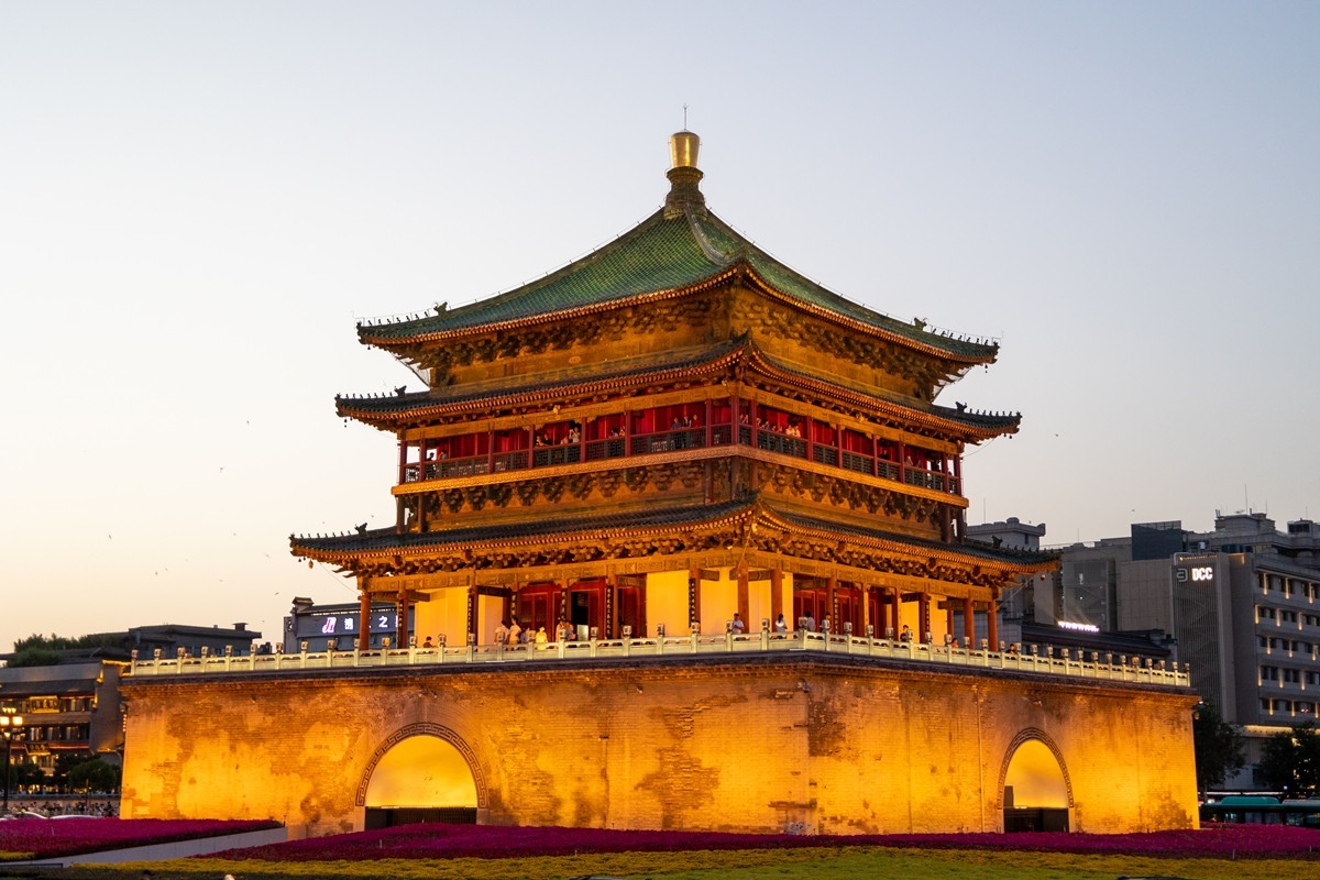 西安鐘樓坐落于西安市明城墻內(nèi)四條大街交匯處,是中國(guó)現(xiàn)存規(guī)模最大、保存最完整的鐘樓。它如一枚沉穩(wěn)的印章,穩(wěn)穩(wěn)蓋在西安的城市心臟,成為街巷間最醒目的標(biāo)識(shí)。當(dāng)暮色四合、華燈初上,鐘樓就褪去了時(shí)光的厚重,暖黃燈光從窗欞間漫溢,為青磚鍍上溫柔金邊,檐角原本威嚴(yán)的獸首,在夜色里也添了幾分憨態(tài)。駐足樓下,抬頭可見鎏金寶頂在燈影中微光閃爍,滾滾車流環(huán)繞其行,恍惚間便能觸碰到這座城從長(zhǎng)安到西安的千年流轉(zhuǎn)。(小莊礦 雷智勇)