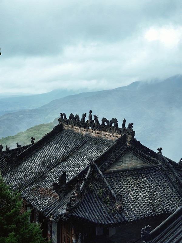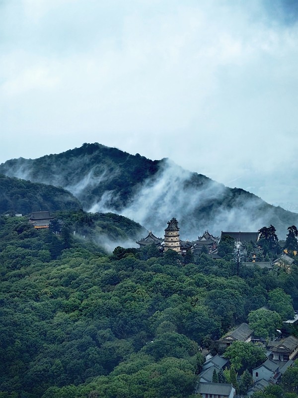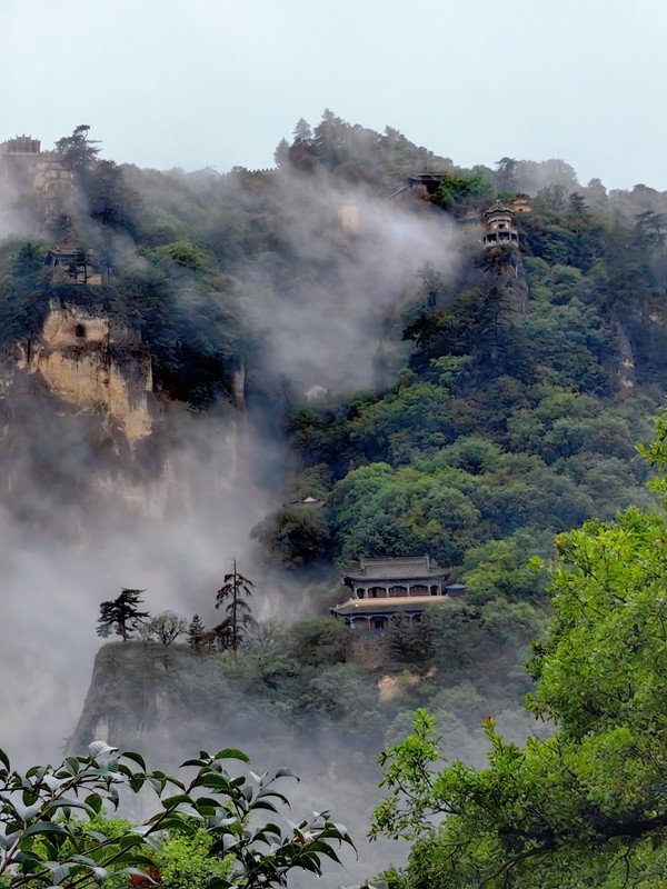 崆峒山的綠,是層層疊疊的。樹木擠滿山巒,像海浪一樣起伏,深綠、淺綠交錯,鋪滿整個視野。而更讓人驚嘆的是云海——乳白色的云霧翻涌流動,時而淹沒山峰,時而散開一角,露出陡峭的崖壁和古老的建筑。那些山峰仿佛在云海中漂浮,成了一座座懸空的仙島。