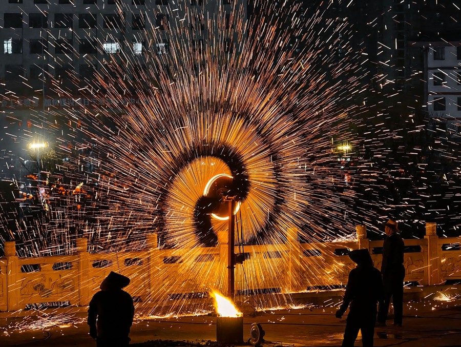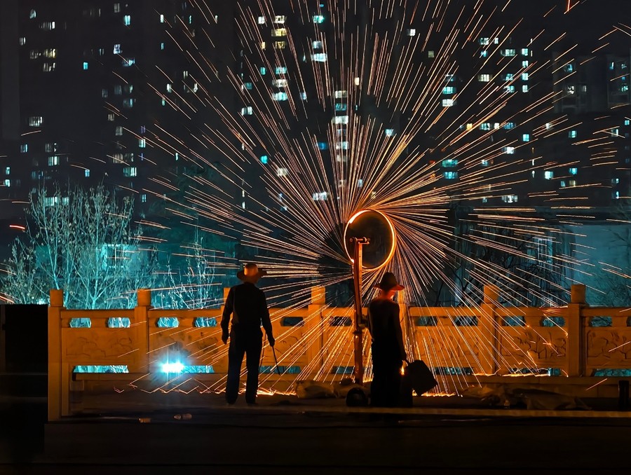 彬州開元廣場(chǎng)上,一場(chǎng)1600℃的非遺浪漫在夜色中璀璨綻放。滾燙的鐵水化作鎏金,在匠人奮力揮灑間,瞬間騰空而起,炸裂成漫天星河。萬千星火傾瀉而下,流光溢彩映照著古老的彬塔,千年絕技于此驚艷重現(xiàn)。